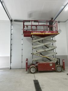 Given the height and weight of the door, our team utilized a scissor lift to safely and accurately complete the installation. The process included mounting heavy-duty tracks, installing reinforced hardware, and carefully balancing the system to ensure smooth operation.